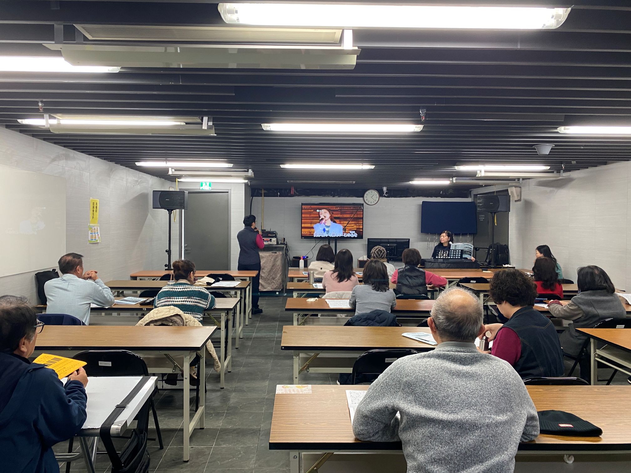 老師課堂彈琴教唱,以日本排行演歌及懷念日本歌謠做為教材,讓學生體會歌曲意境,同時教同學認識樂譜、樂理、歌唱技巧等,在歌詞與樂曲的配合中,引導感情的詮釋,讓同學享受歡唱的樂趣、卡拉OK享受學習成果。